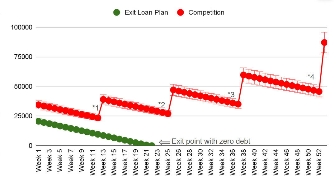 With the Exit Plan Loan, a $1,000 monthly payment can fully repay your loan in under 22 weeks. In contrast, similar payments toward competitors’ working capital loans for 52 weeks may result in repaying over four times the original borrowed amount.